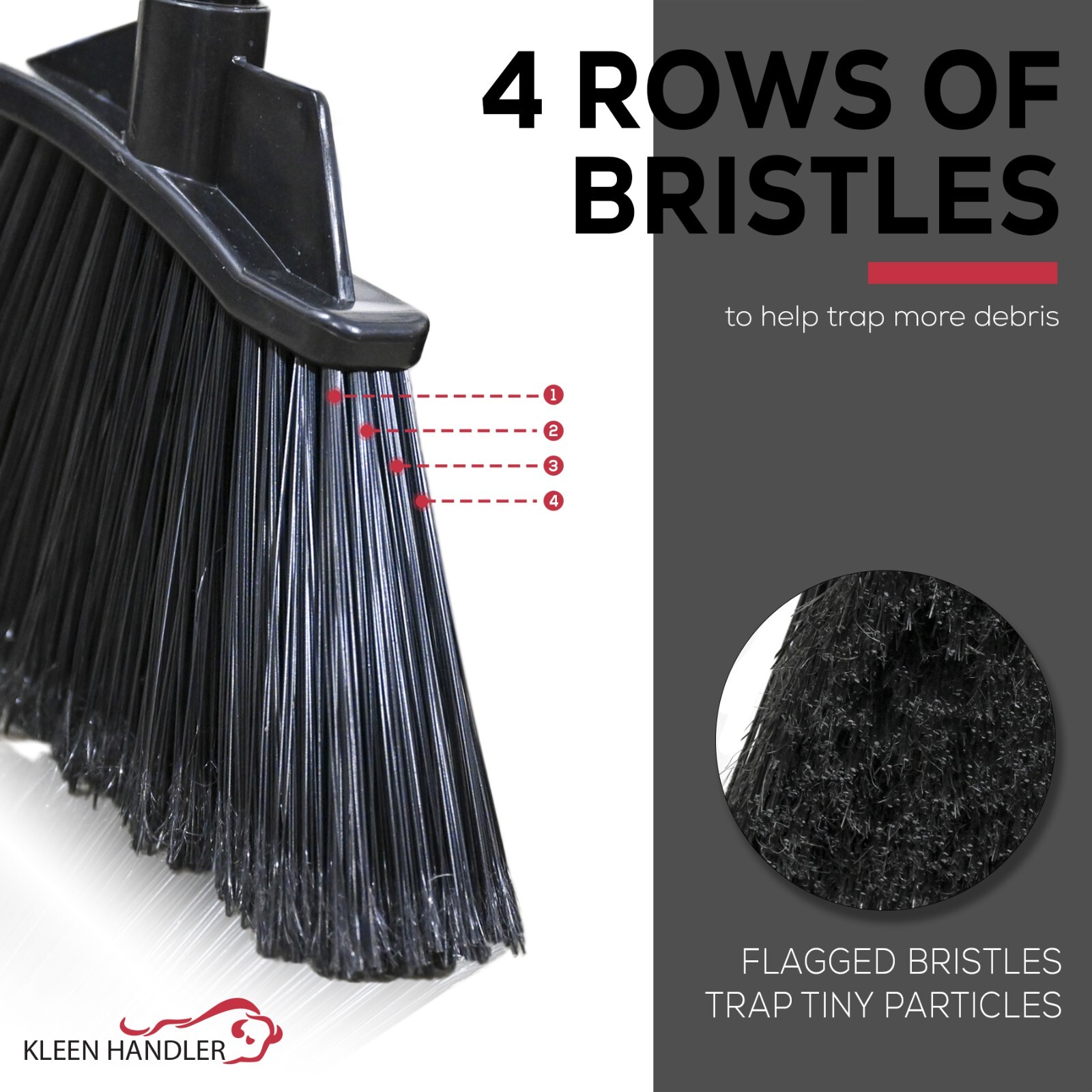 • EFFICIENT CLEANING: Say goodbye to stubborn messes! With four rows of polypropylene bristles, this broom captures dust, hair, and debris, leaving your floors spotless. Its angled bristles effortlessly reach corners and tight spots, while the wide broom head covers more ground with each sweep.