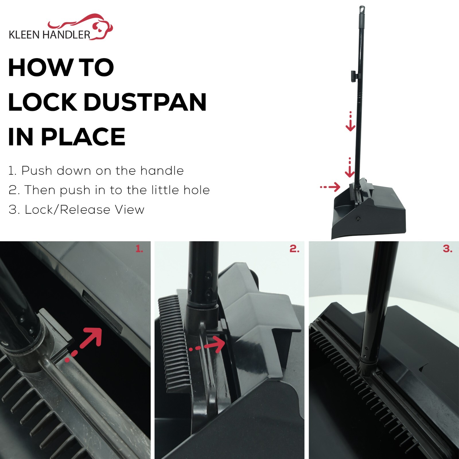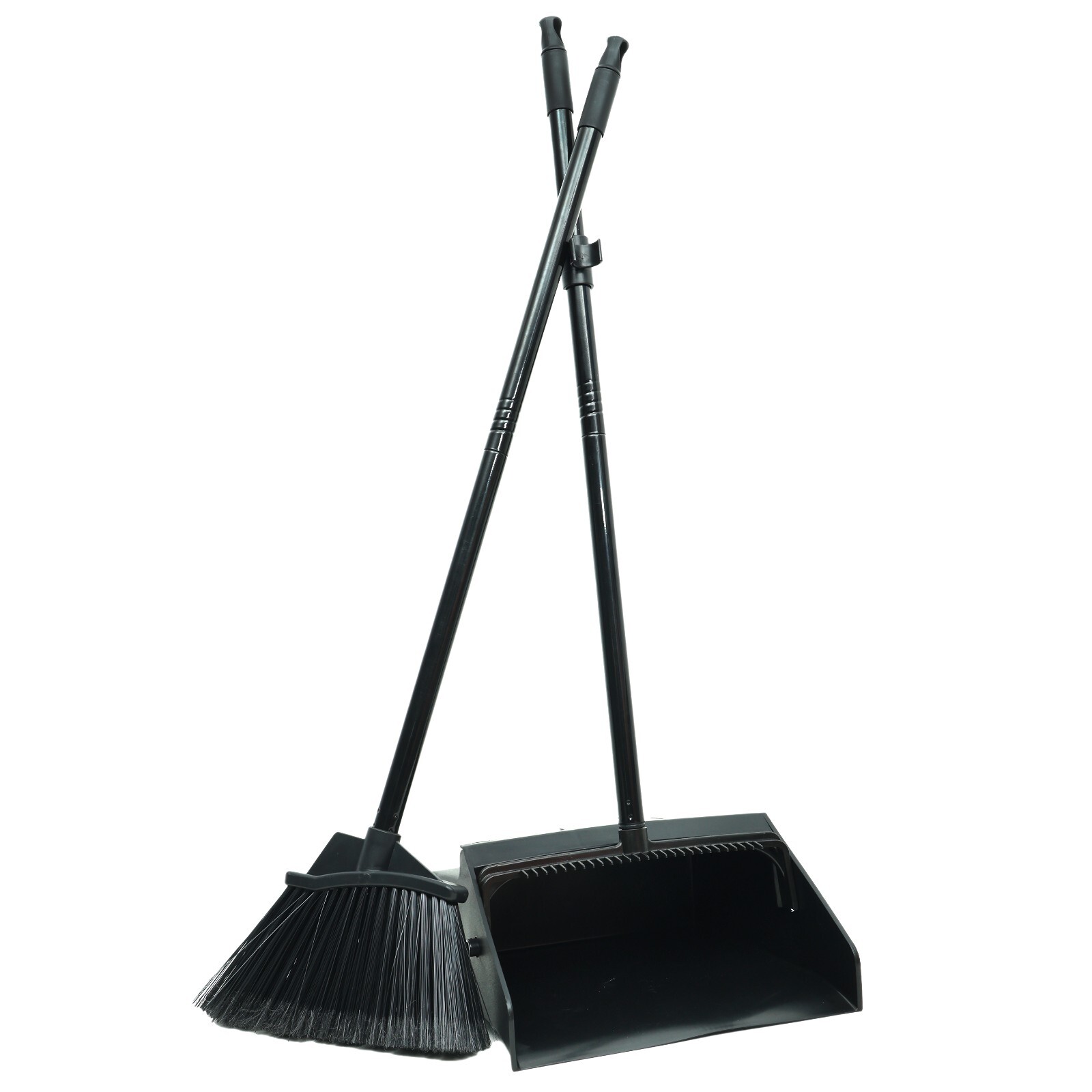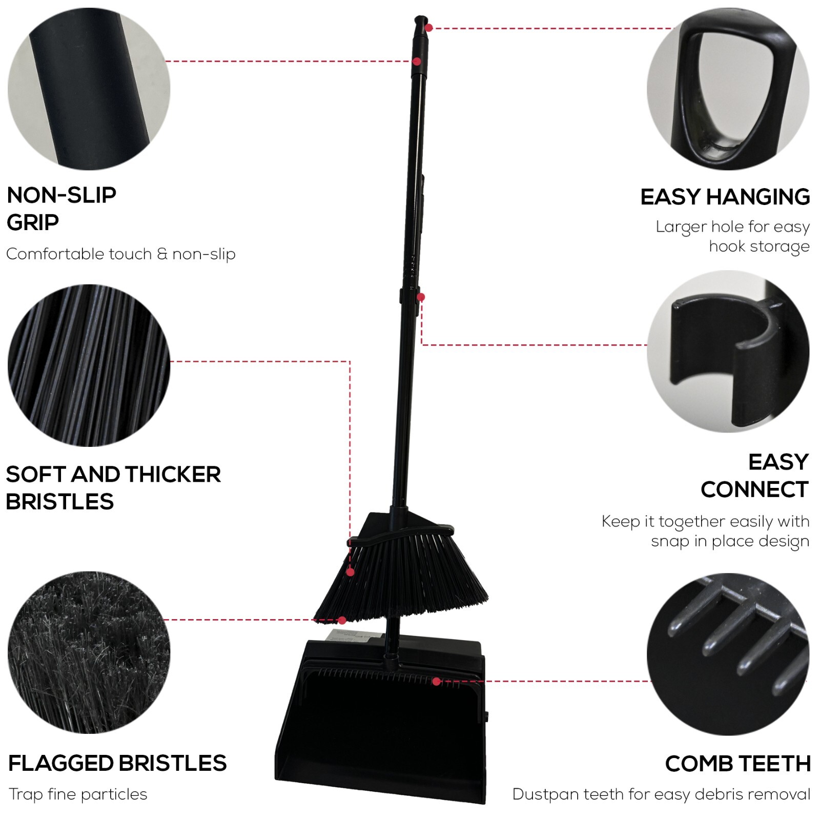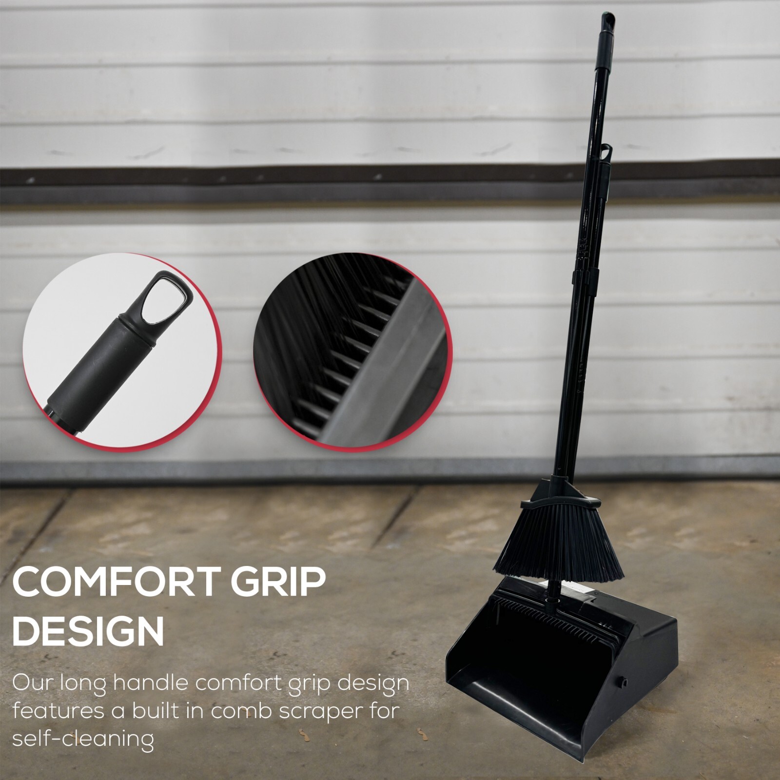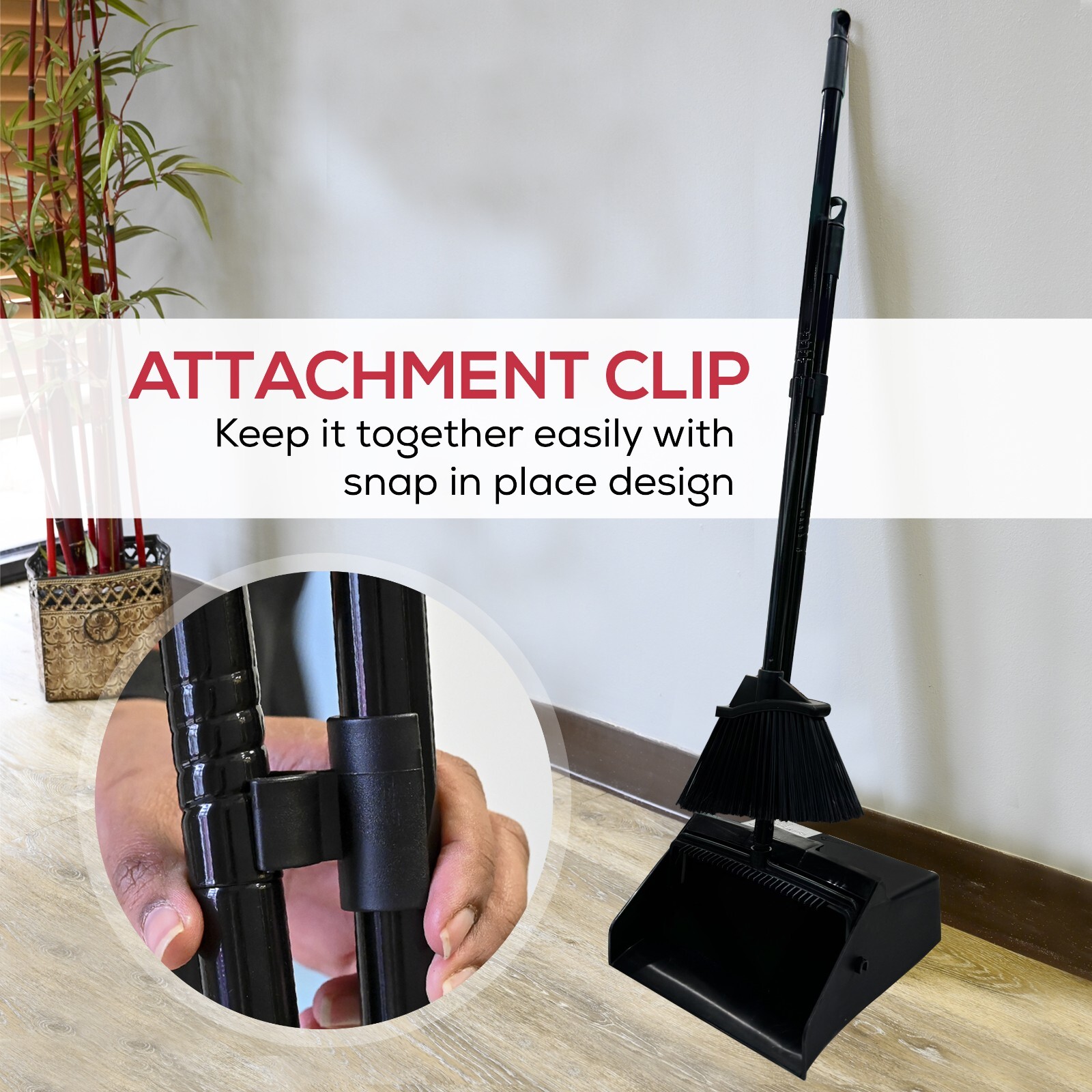 • SPACE-SAVING STORAGE: No more clutter! The sleek design of the black broom and dustpan set requires minimal storage space. It stands upright and features a snap-on clip for easy attachment, fitting perfectly in corners or maintenance closets.